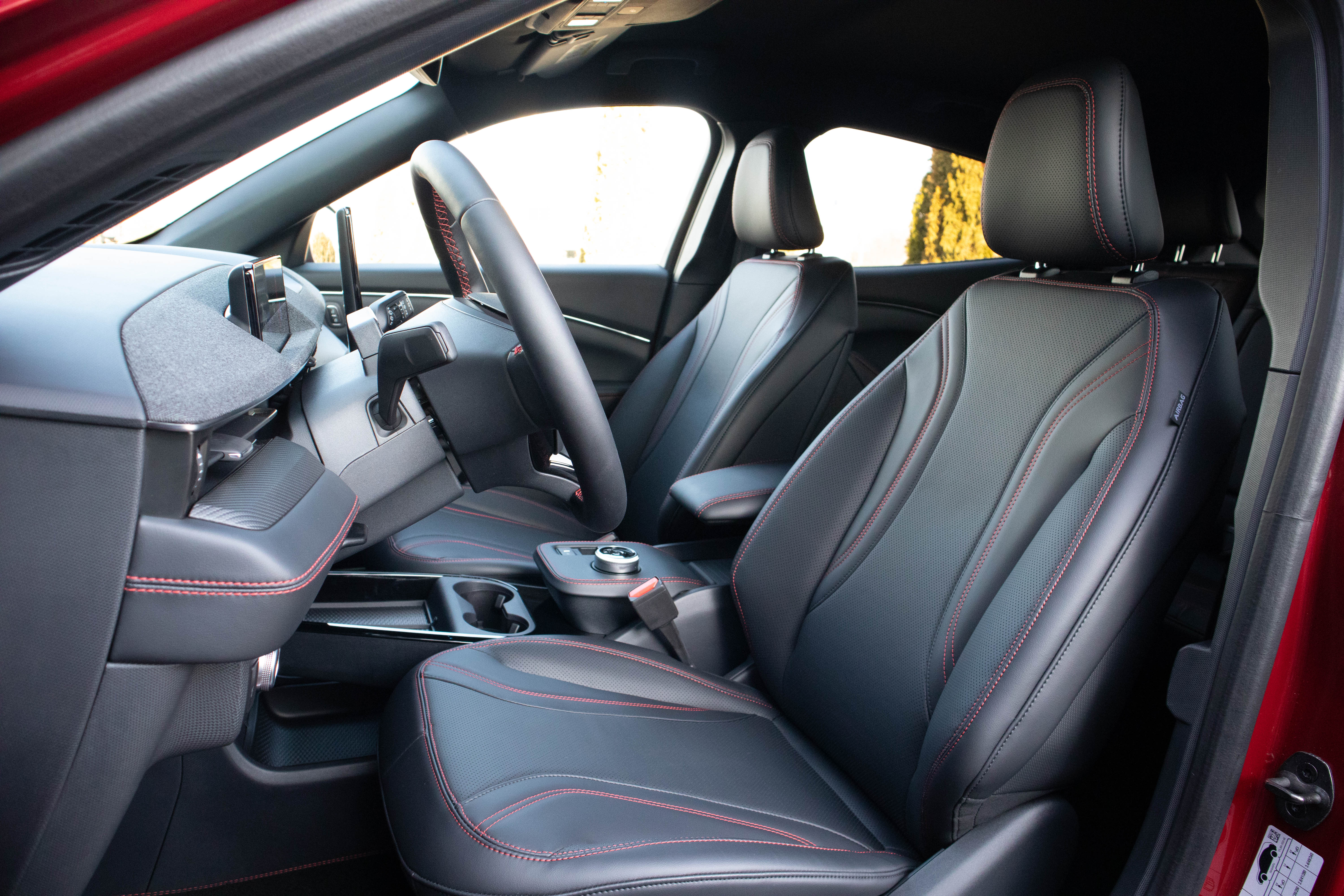 • Scaune fata confort cu insertii din piele ecologica perforata Sensico si cusaturi rosii